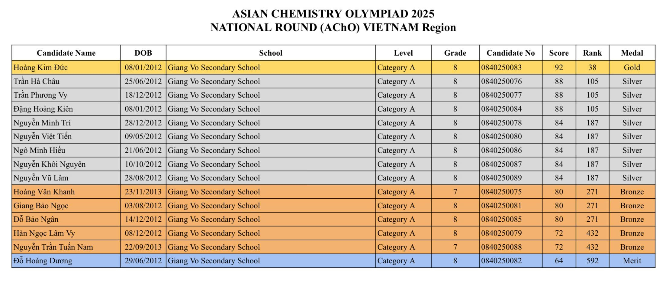 Tại Vòng thi Quốc gia Kỳ thi AChO 2026, diễn ra vào ngày 06/12/2025, trường THCS Giảng Võ có 15 học sinh tham gia và đã đạt được kết quả vô cùng ấn tượng với tỉ lệ đạt giải 100%, gồm: