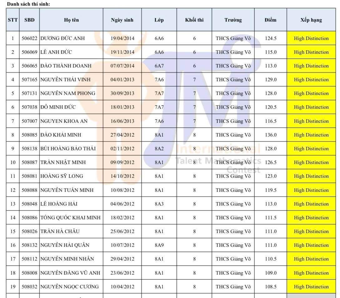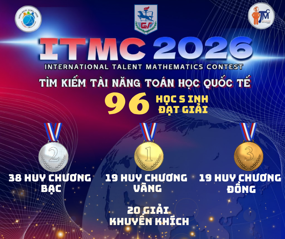 Tranh tài tại vòng Quốc gia kỳ thi Tìm kiếm Tài năng Toán học Quốc tế - ITMC 2026 (International Talent Mathematics Competition) diễn ra vào ngày 14/12/2025, học sinh trường THCS Giảng Võ đã xuất sắc giành được 96 giải thưởng trong đó có 76 Huy chương Vàng, Bạc, Đồng.