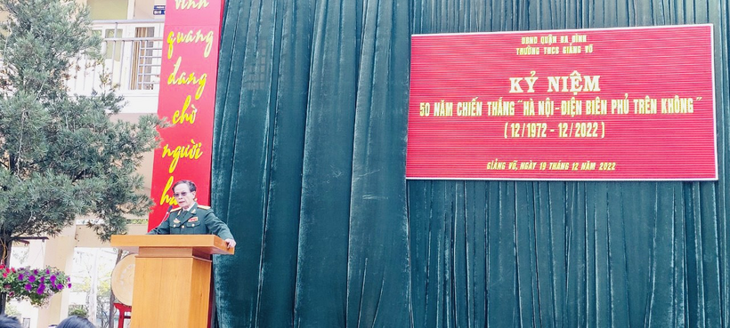 Cùng với hoạt động vẽ tranh, ngày 19/12/2022, trong buổi sinh hoạt dưới cờ đầu tuần hướng tới kỷ niệm 50 năm chiến thắng Điện Biên Phủ trên không và 78 năm ngày thành lập Quân đội Nhân dân Việt Nam, trường THCS Giảng Võ vinh dự được đón Đại tá Nguyễn Mạnh Hùng – Chủ tịch Hội Cựu chiến binh phường Giảng Võ và Đại tá Vũ Văn Lương – Phó Chủ tịch Hội Cựu chiến binh phường Giảng Võ đến trò chuyện. Trong buổi nói chuyện lịch sử, các em được nghe Đại tá Vũ Văn Lương chia sẻ về những năm tháng khó khăn nhưng thật đáng tự hào bác đã đi qua. Chương trình kết thúc với các tiết mục văn nghệ sôi động, được dàn dựng công phu của học sinh trường THCS Giảng Võ như một lời tự nhủ sẽ luôn cố gắng tiếp bước cha ông để xây dựng đất nước ngày một giàu đẹp hơn.