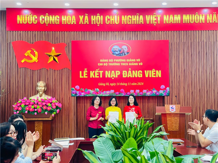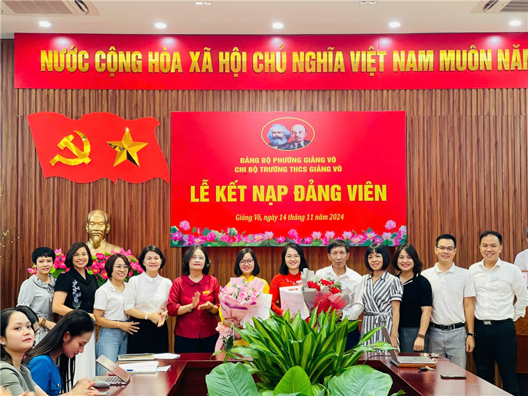 Công tác bồi dưỡng, kết nạp Đảng viên mới là nhiệm vụ thường xuyên, có ý nghĩa quan trọng của Chi bộ trường THCS Giảng Võ, góp phần phát triển, nâng cao chất lượng và sức chiến đấu của tổ chức cơ sở Đảng nói chung và của cá nhân Đảng viên nói riêng. Chiều ngày 14/11/2024, Chi bộ trường THCS Giảng Võ đã tổ chức Lễ kết nạp Đảng cho 2 quần chúng ưu tú là cô giáo Lương Thị Hải Yến – giáo viên tổ Văn - Sử - Địa - GDCD và cô giáo Ngô Thị Tuyên – giáo viên tổ Toán - Công nghệ - Tin.