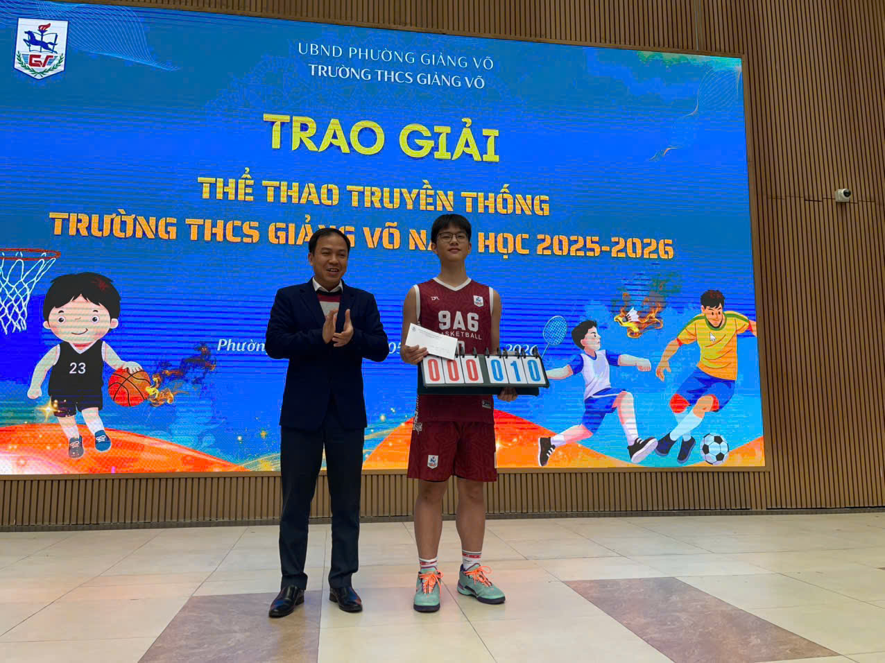 Ngay sau khi các trận chung kết bóng rổ khép lại, nhà trường đã tổ chức Lễ trao giải Thể thao cấp trường năm học 2025-2026. Bên cạnh việc vinh danh các tập thể đạt thành tích cao ở bộ môn bóng rổ, Ban Tổ chức cũng trao thưởng cho các học sinh xuất sắc ở nhiều môn thể thao khác như cờ vua, cờ tướng, cầu lông và bóng đá. Mỗi phần thưởng là sự ghi nhận xứng đáng cho nỗ lực, ý chí và tinh thần rèn luyện không ngừng của các em trong suốt mùa giải.