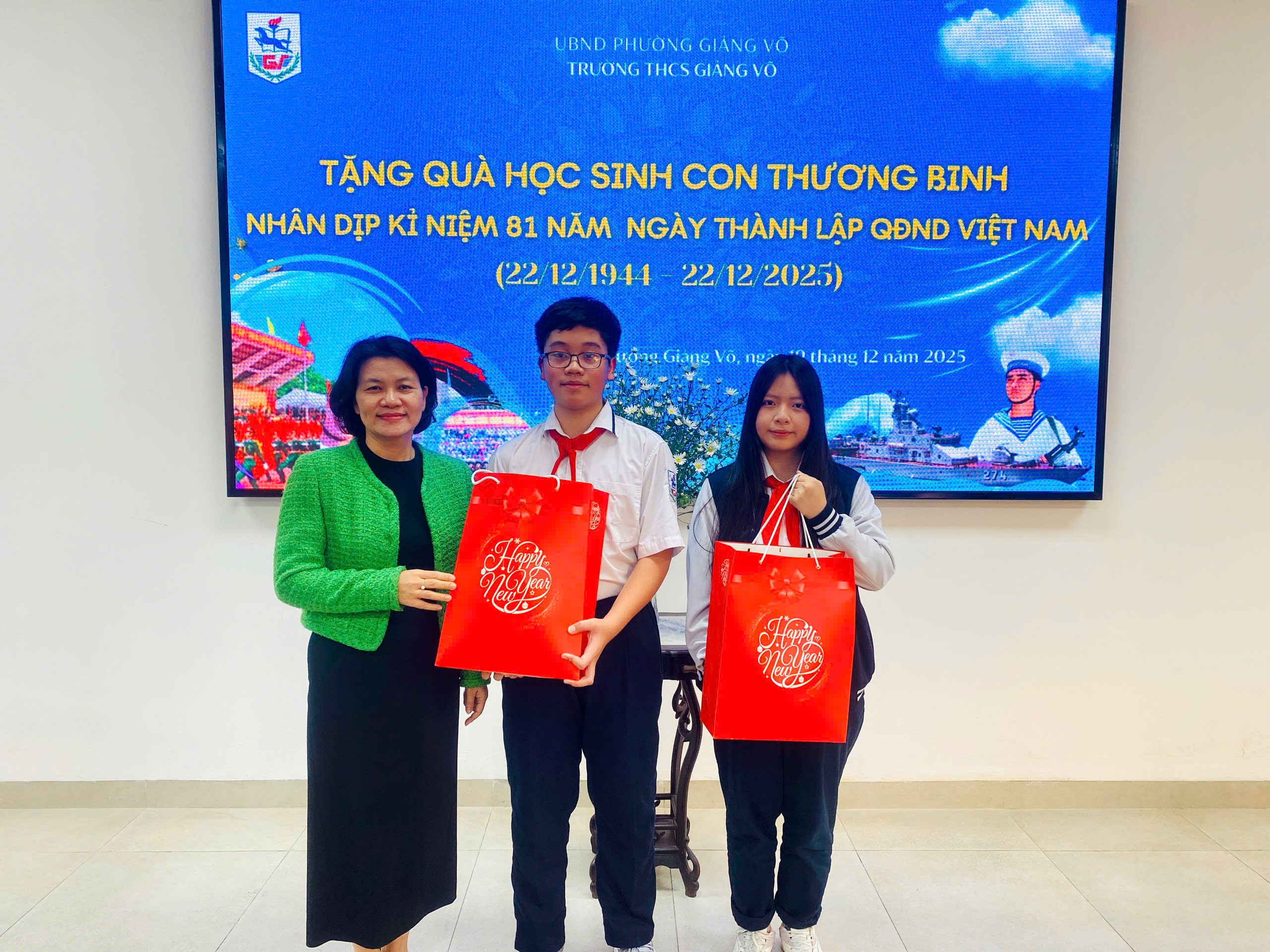Trước đó, vào ngày 19/12/2025, nhà trường đã gửi tặng những phần quà ý nghĩa tới hai học sinh là con thương binh đang học tập tại trường: em Nguyễn Vũ Minh Đan, học sinh lớp 9A12 và em Lâm Quang Minh, học sinh lớp 7A9. Mỗi phần quà nhỏ là lời động viên ấm áp, là sự khích lệ nhà trường gửi tới các em – thế hệ trẻ lớn lên từ truyền thống gia đình giàu hy sinh, cống hiến. Mang trong mình niềm tự hào ấy, các em thêm vững tin, thêm nghị lực để quyết tâm học tập, luyện rèn, tiếp nối phẩm chất kiên cường, dũng cảm của cha anh đi trước.