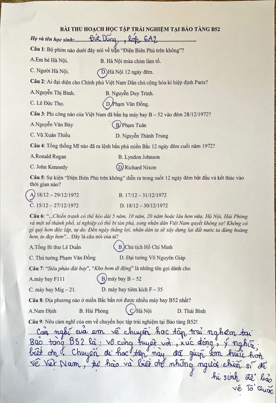 Bảo tàng Chiến thắng B52 là nơi trưng bày các vũ khí, khí tài lập công của quân và dân Thủ đô trong trận "Điện Biên Phủ trên không" năm 1972, lưu giữ hình ảnh hiện vật về tinh thần quyết chiến, quyết thắng, mưu trí, sáng tạo của quân và dân Thủ đô. Đến Bảo tàng, các em học sinh được tham quan triển lãm trưng bày hơn 300 hình ảnh, hiện vật và tài liệu theo các chủ đề: Âm mưu của Mỹ; Hà Nội chiến đấu và chiến thắng; Tội ác của Mỹ và sự trừng phạt; Thế giới ủng hộ và ngợi ca chiến thắng; Hà Nội xưa và nay. Đặc biệt, học sinh được thăm phòng sa bàn tổng hợp diễn biến trận đánh 12 ngày đêm với các thước phim trên 3 màn hình và hệ thống ánh sáng, âm thanh, tạo khói… Thời gian, không gian chiến đấu quyết liệt của trận đánh 12 ngày đêm đã được tái hiện thật sinh động, rõ nét và gây ấn tượng sâu sắc trong lòng mỗi em học sinh.