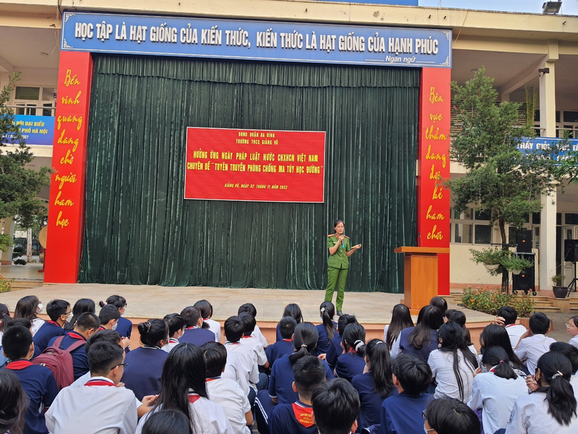 Thiếu tá Nguyễn Thu Hà trực tiếp tuyên truyền về tác hại của ma túy cho học sinh