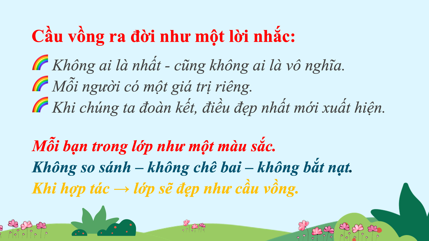 Thông điệp của tiết sinh hoạt được đúc kết thông qua hình ảnh chiếc cầu vồng rực rỡ: mỗi màu sắc mang giá trị riêng, và chỉ khi hòa hợp và đoàn kết mới tạo nên vẻ đẹp rực rỡ như chính những mối quan hệ bạn bè đẹp đẽ trong mái trường Giảng Võ.