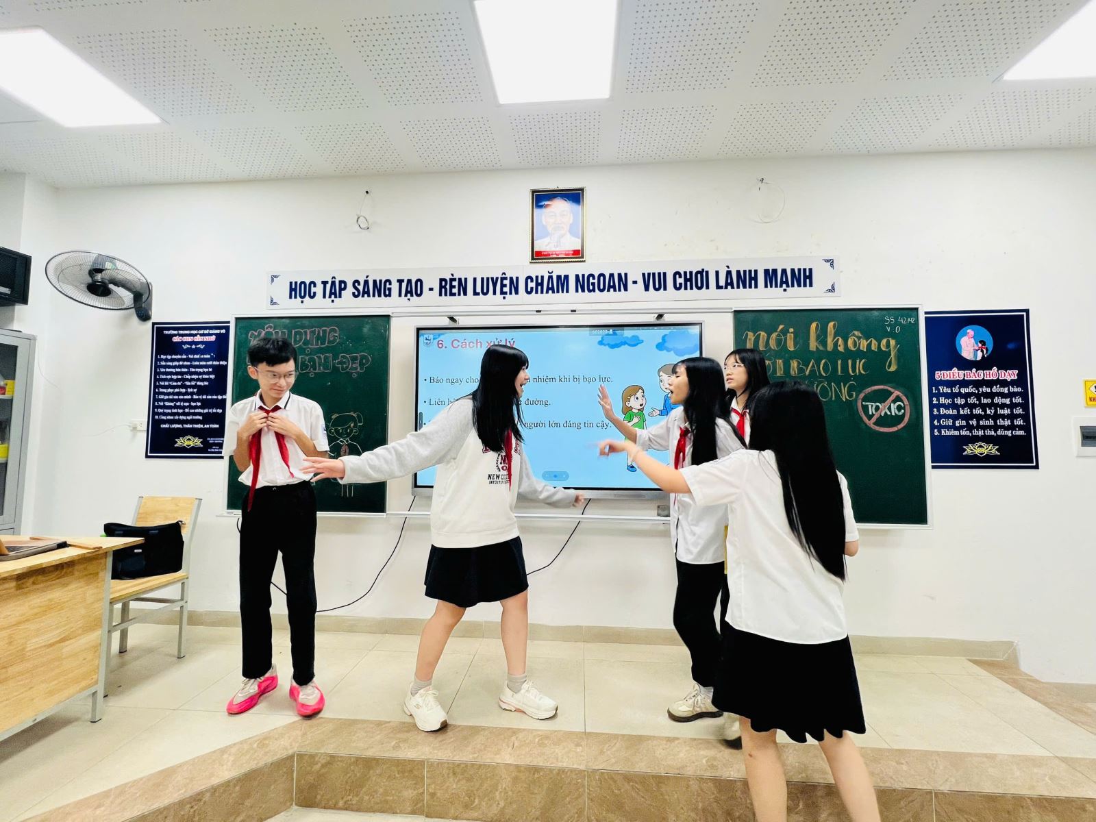 Đáng chú ý, các em học sinh đã cùng nhau xử lí các tình huống giả định, đưa ra cách ứng xử phù hợp và thực hành kỹ năng kiểm soát cảm xúc, giải quyết xung đột thông qua các tiểu phẩm tuyên truyền do chính các em xây dựng và biểu diễn. Từ đó mỗi học sinh tự rút ra bài học như : im lặng không phải là lựa chọn an toàn, khi đối diện bạo lực, các em cần báo ngay cho giáo viên chủ nhiệm, tìm sự hỗ trợ từ bạn bè tin cậy hoặc liên hệ phòng tham vấn tâm lý của trường.
