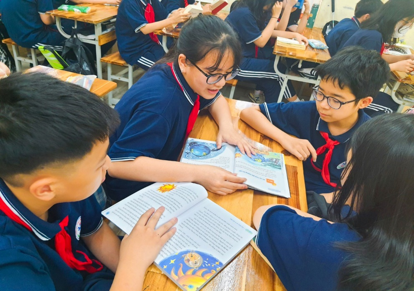 Các em học sinh hào hứng chia sẻ với nhau những kiến thức thú vị từ sách