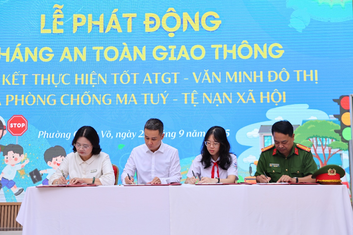 Cùng với đó, đại diện nhà trường, công an phường Giảng Võ, Ban thường trực Cha mẹ học sinh và học sinh các lớp cũng lên kí tên vào cam kết như một lời hứa thực hiện tốt mục tiêu an toàn giao thông, văn minh đô thị và phòng chống ma túy – tệ nạn xã hội.