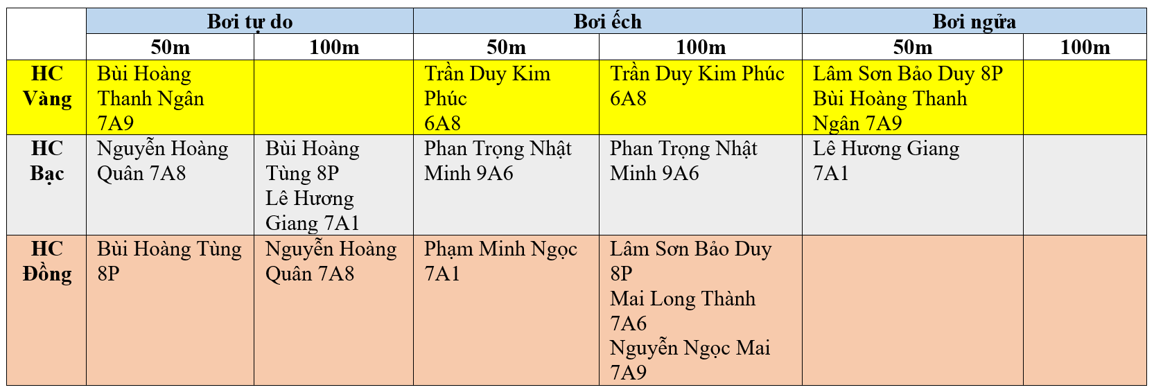 Đặc biệt, em học sinh Trần Duy Kim Phúc lớp 6A8 và Bùi Hoàng Thanh Ngân lớp 7A9 đã xuất sắc giành được 2 huy chương Vàng cá nhân ở hai nội dung bơi.
