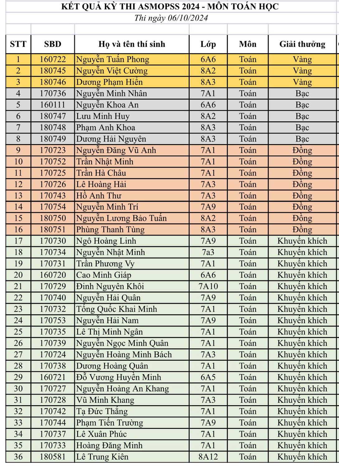 Danh sách học sinh đạt giải môn Toán trong kỳ thi ASMOPSS 2024