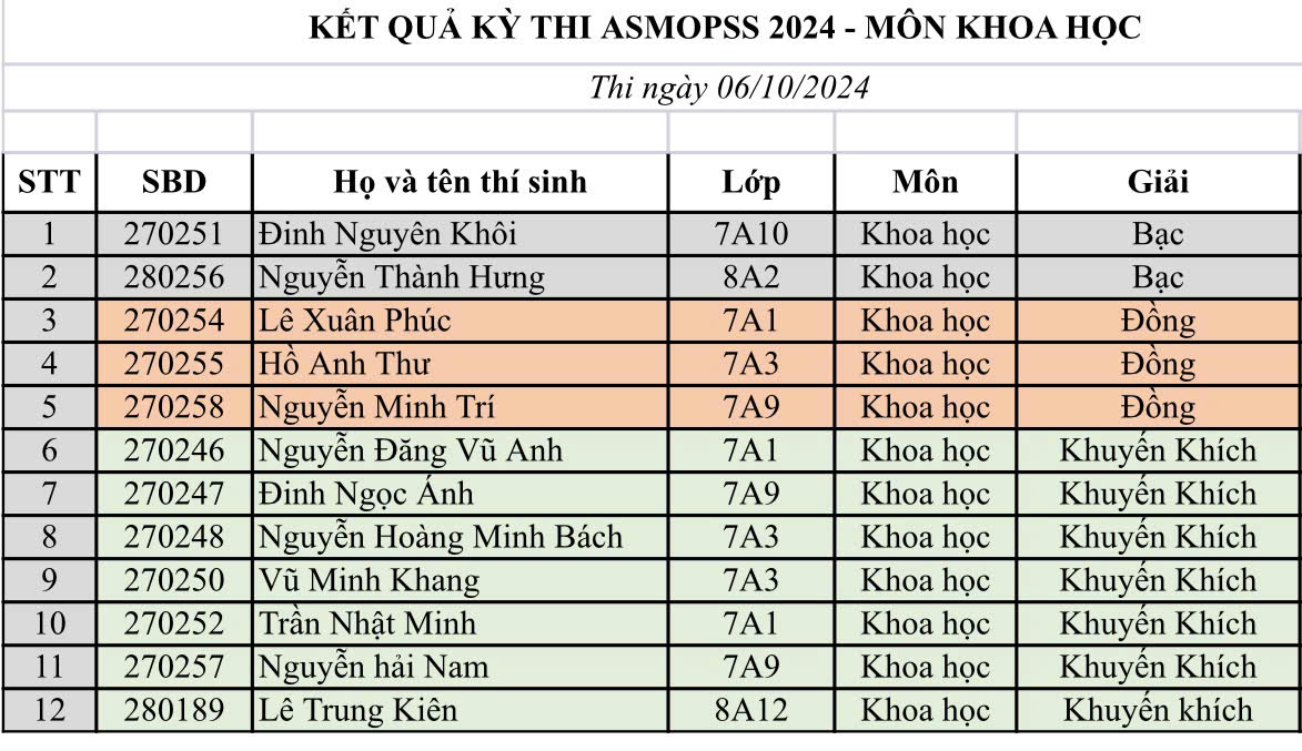 Danh sách học sinh đạt giải môn Khoa học trong kỳ thi ASMOPSS 2024