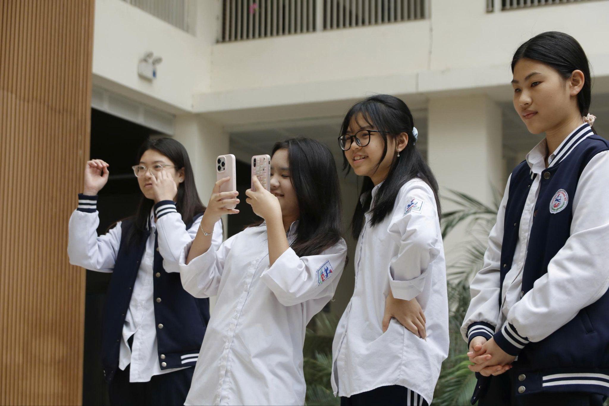 Các em học sinh hào hứng ghi lại những trải nghiệm của mình