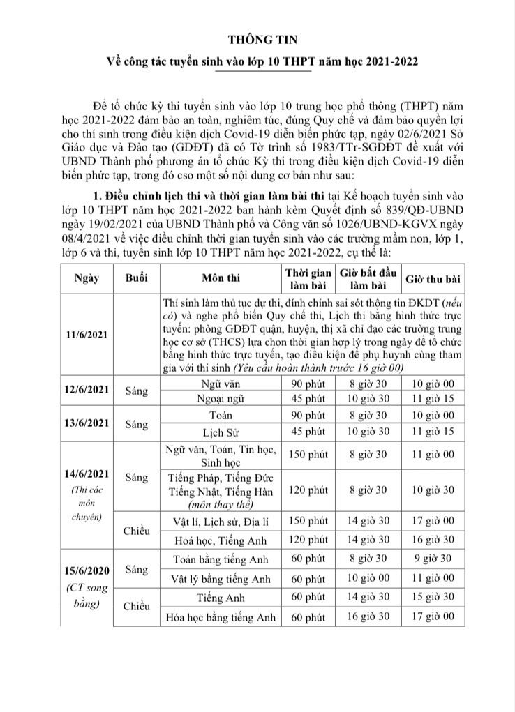 Ngày 02/6/2021, UBND Thành phố đã nhất trí phương án điều chỉnh một số nội dung trong Kế hoạch tuyển sinh vào lớp 10 THPT năm học 2021-2022. Dưới đây là Tờ trình của Sở GD&ĐT (kèm theo nội dung thông tin báo chí)