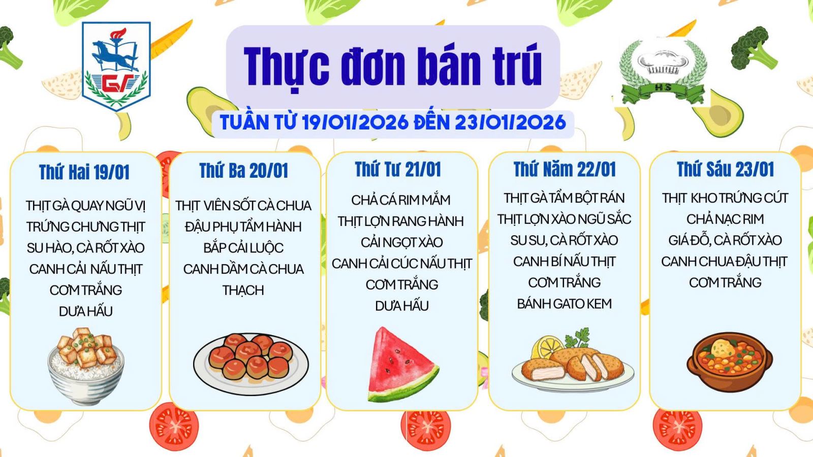 Thực đơn bán trú (Áp dụng từ ngày 19/1/2026 đến 23/1/2026)