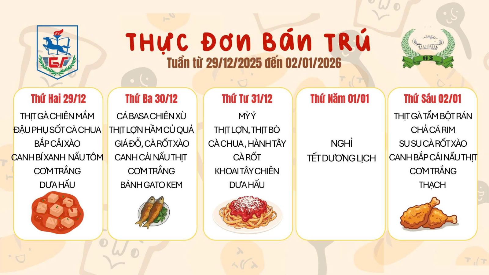Nhà trường xin kính gửi Phụ huynh Thực đơn bán trú (Áp dụng từ ngày 29/12/2025 đến 2/1/2026):
