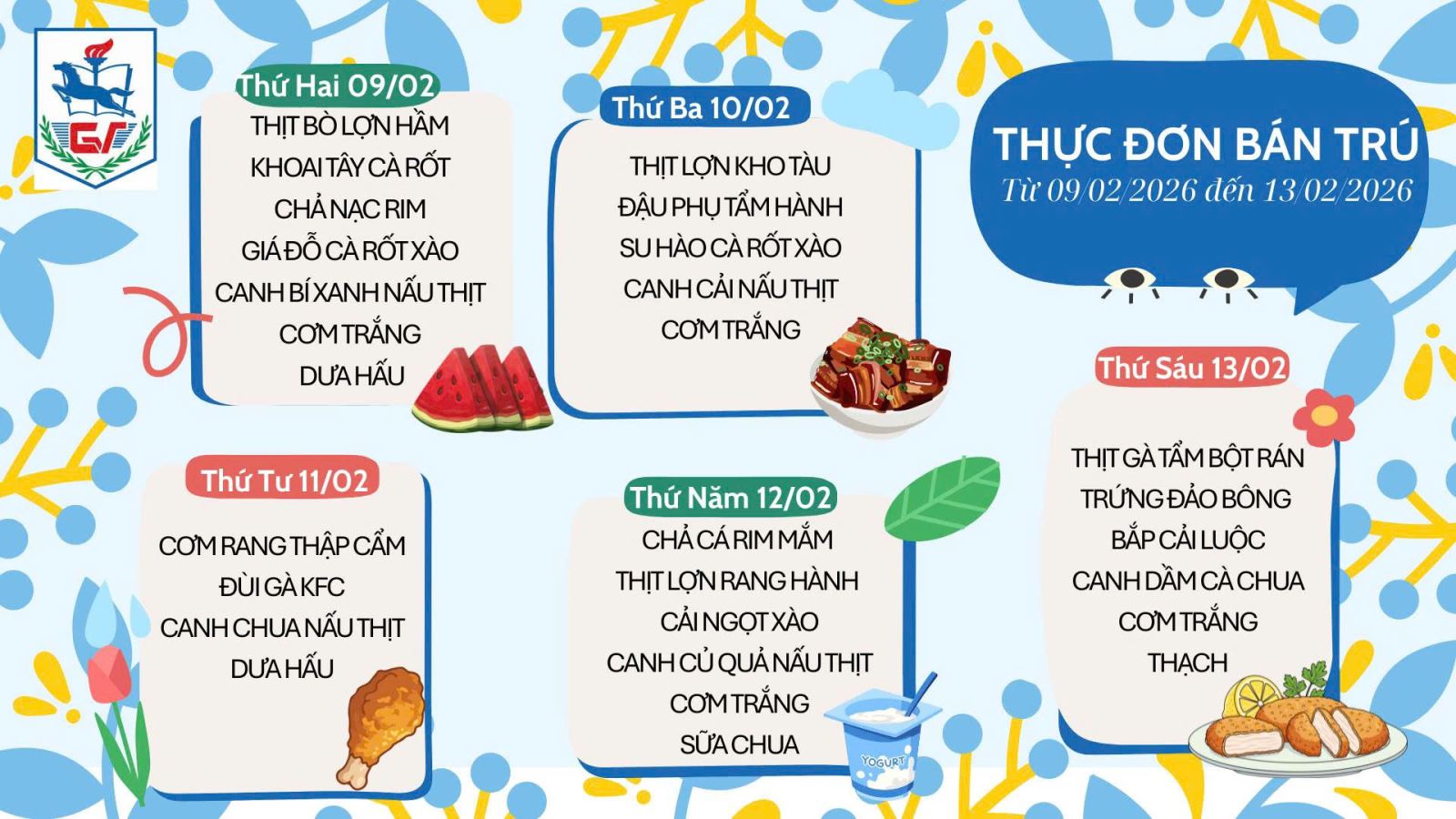 Thực đơn bán trú (Áp dụng từ ngày 9/2/2026 đến 13/2/2026)