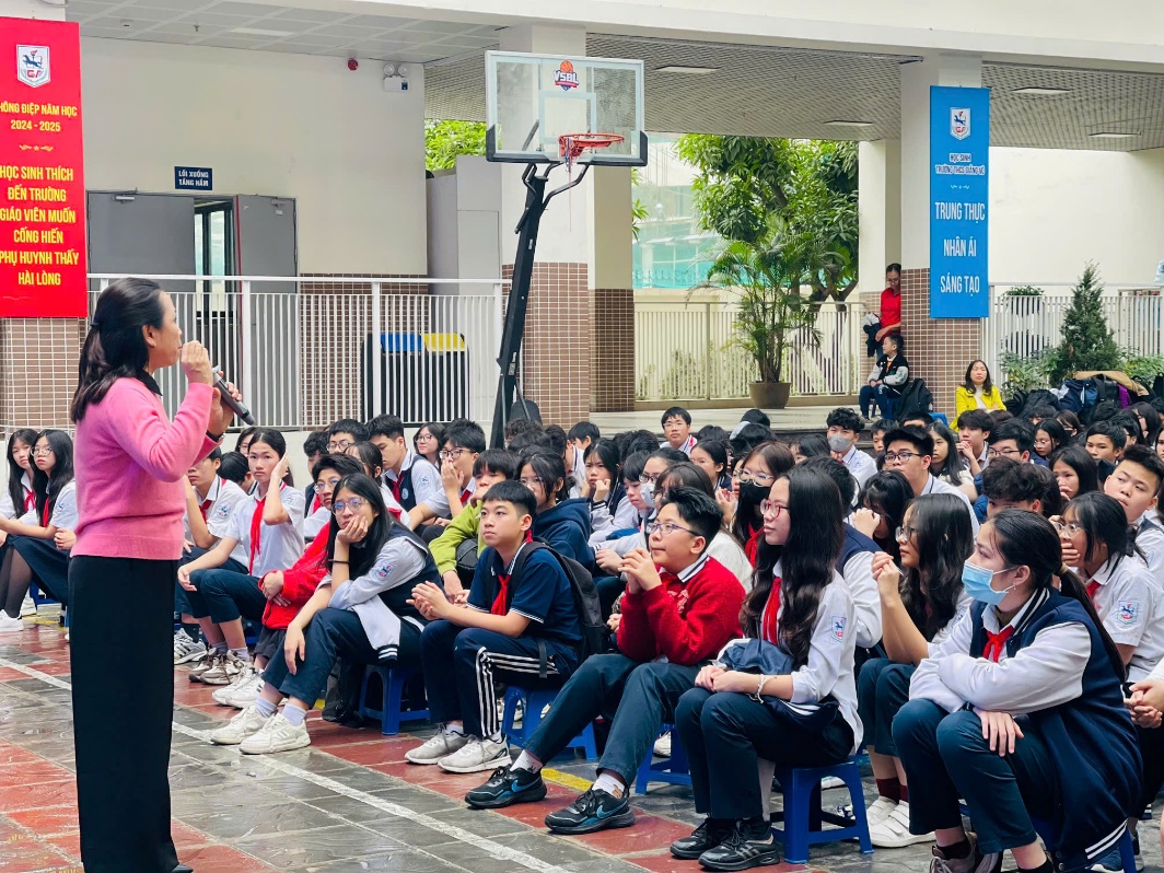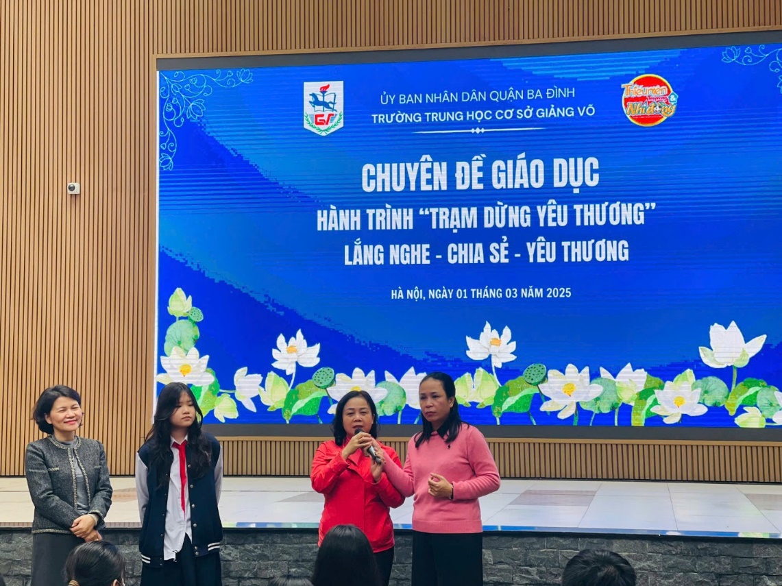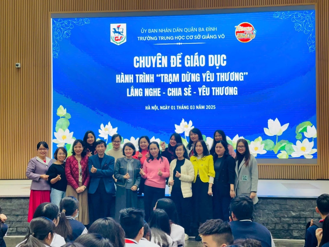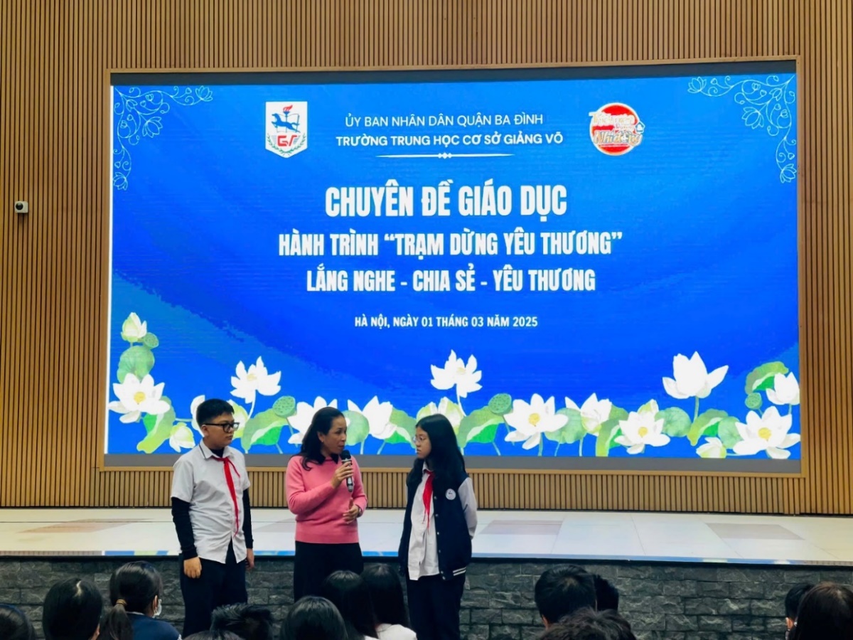 Ngày 01/03/2025, trường THCS Giảng Võ phối hợp cùng chuyên gia Tâm lý giáo dục Nguyễn Lệ Thủy – Báo Thiếu niên tiền phong và Nhi đồng tổ chức chuyên đề giáo dục “Hành trình Trạm dừng yêu thương” dành cho học sinh khối 7, 8 ca chiều của nhà trường.