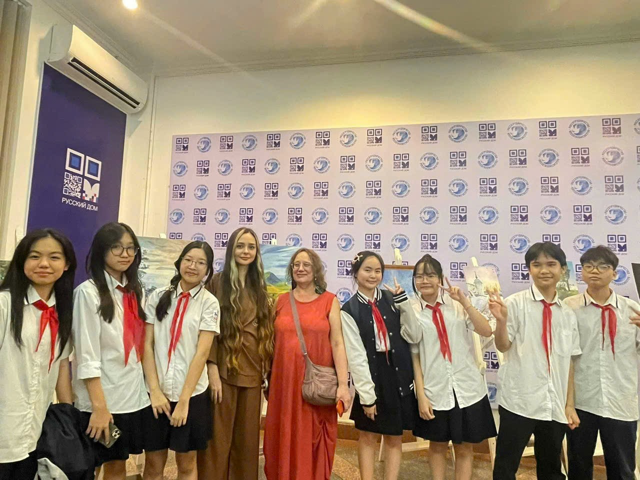 Bên cạnh đó, các em rất thích thú khi được trực tiếp chiêm ngưỡng các tác phẩm hội họa của các họa sĩ Nga đương đại. Bạn Đinh Uyển Nhi – học sinh lớp 8A1 – chia sẻ: “Qua những lời chia sẻ đầy cảm xúc về ý nghĩa của những bức tranh, em nhận ra rằng nguồn cảm hứng sáng tác không chỉ đến từ thiên nhiên hùng vĩ của nước Nga mà còn từ lịch sử, văn hoá và tâm hồn của con người nơi đây. Từng tác phẩm hiện ra trước mắt như những câu chuyện, những mảnh ghép của một đất nước mang trong mình sự hùng vĩ của thiên nhiên, sự trầm mặc của lịch sử, và cả sự lãng mạn của những con người say mê nghệ thuật”.