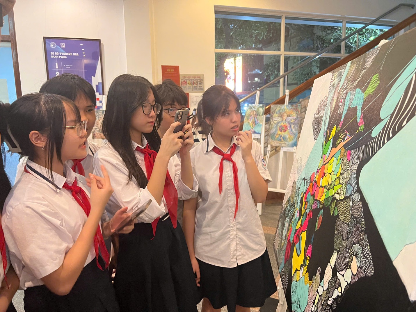 Học sinh chụp hình bên các bức tranh ấn tượng tại triển lãm