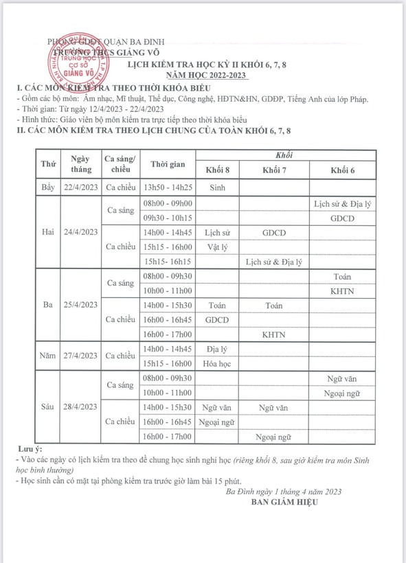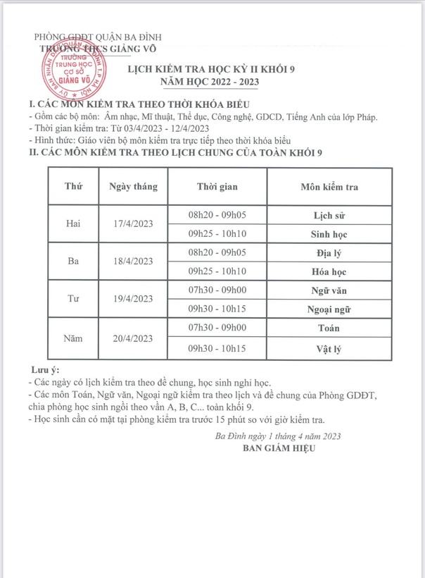 Trường THCS Giảng Võ thông báo lịch kiểm tra học kỳ 2 năm học 2022 - 2023