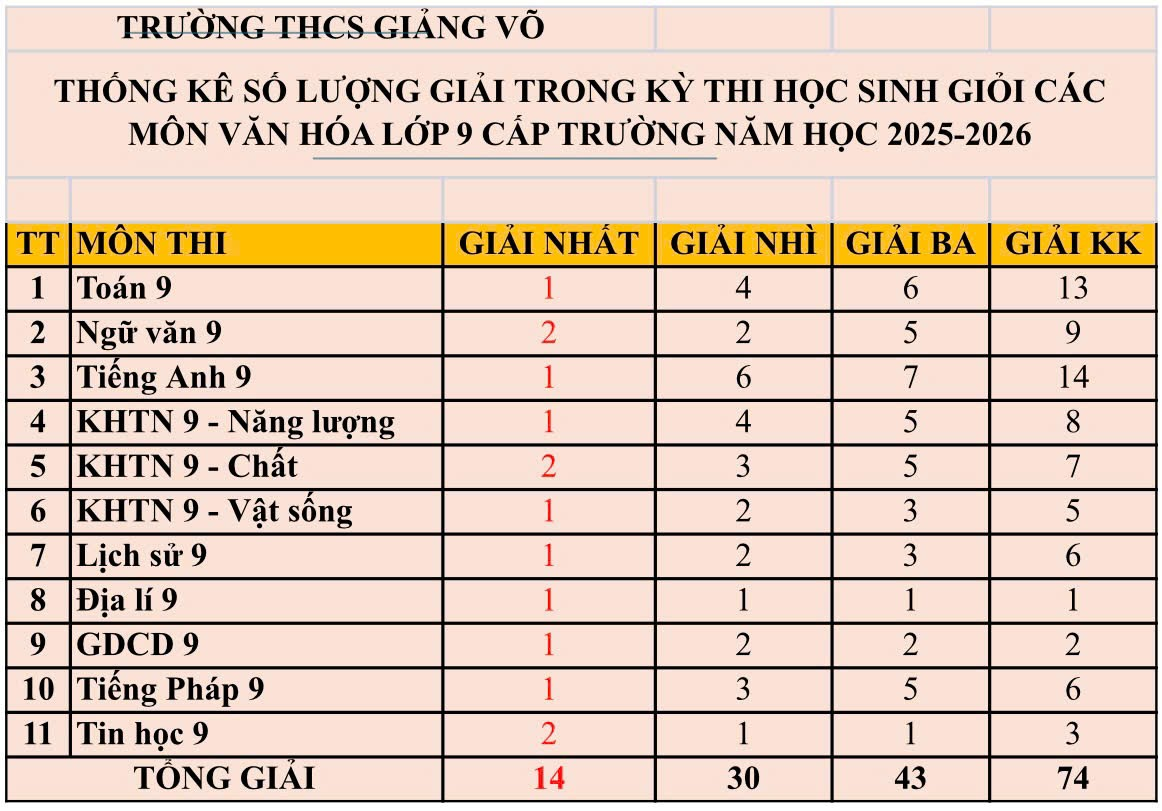 Kết quả ấn tượng của các em học sinh tại kỳ thi chọn Học sinh giỏi lớp 9 cấp Trường đã khẳng định chất lượng đào tạo mũi nhọn và hướng phát triển bền vững của trường THCS Giảng Võ. Thành công của kỳ thi là nền tảng quan trọng để nhà trường tiếp tục phát hiện, bồi dưỡng tài năng, chuẩn bị lực lượng học sinh ưu tú cho kỳ thi Học sinh giỏi lớp 9 cấp Phường và Thành phố trong thời gian tới.