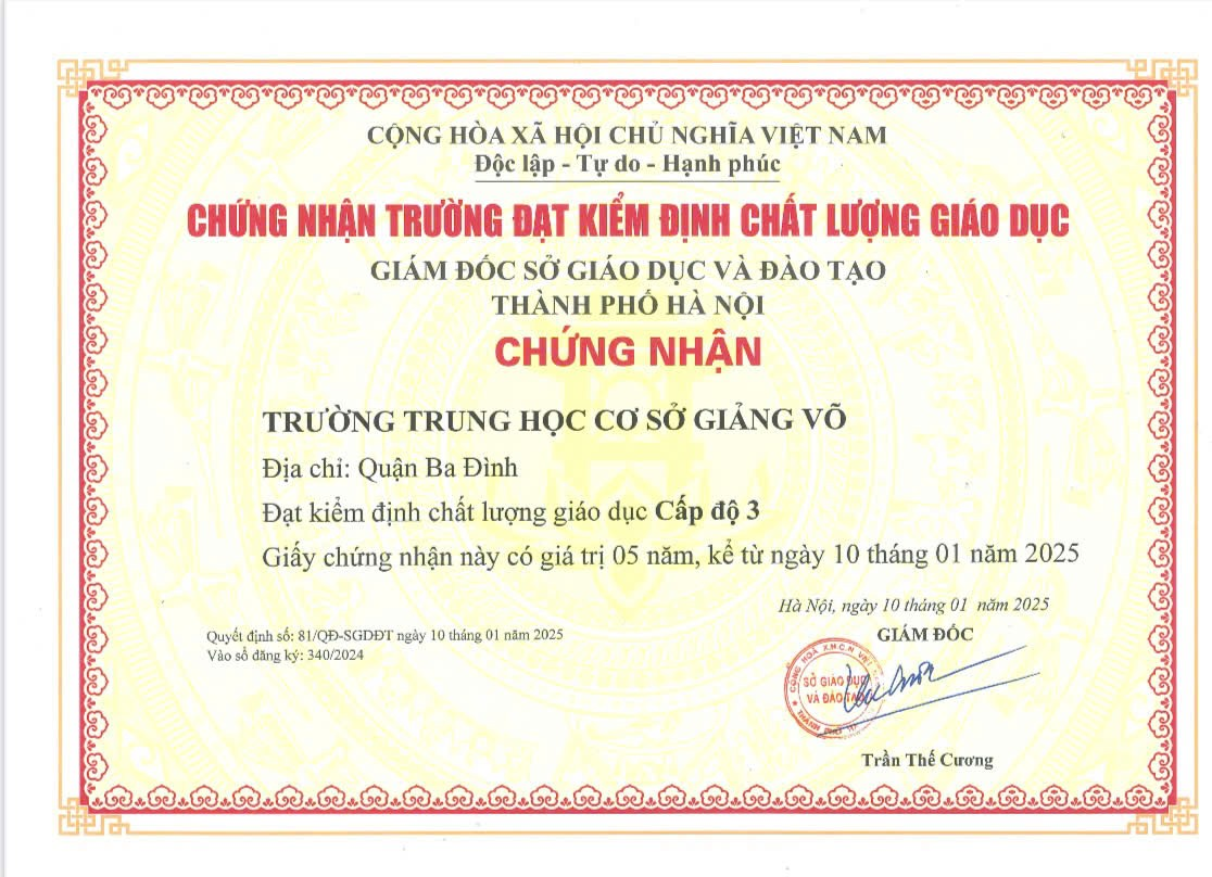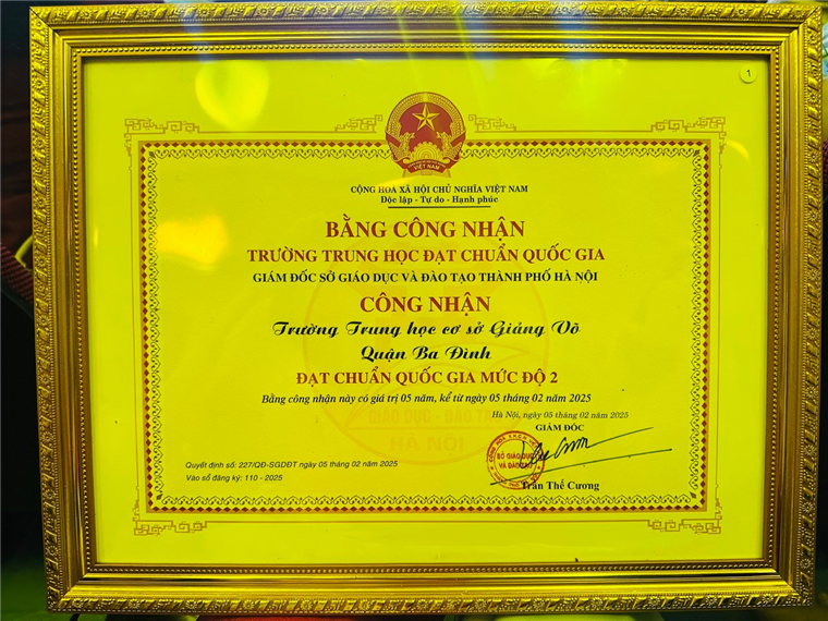 Sáng ngày 04/4/2025, trường THCS Giảng Võ vinh dự nhận Bằng công nhận trường trung học đạt chuẩn quốc gia mức độ 2 trong Hội nghị tổng kết, trao bằng công nhận trường THCS và Tiểu học đạt chuẩn quốc gia năm 2024 do Sở Giáo dục và Đào tạo thành phố Hà Nội tổ chức tại trường THPT chuyên Hà Nội – Amsterdam. Đây là sự kiện có ý nghĩa đặc biệt, là cột mốc quan trọng trong hành trình phát triển của nhà trường, đồng thời khẳng định uy tín, chất lượng giáo dục và những đóng góp bền bỉ của Trường THCS Giảng Võ đối với sự nghiệp giáo dục Thủ đô.