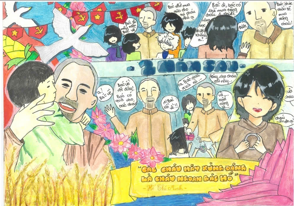 Bức tranh minh họa những việc làm thiết thực của học sinh để noi theo tấm gương đạo đức Hồ Chí Minh