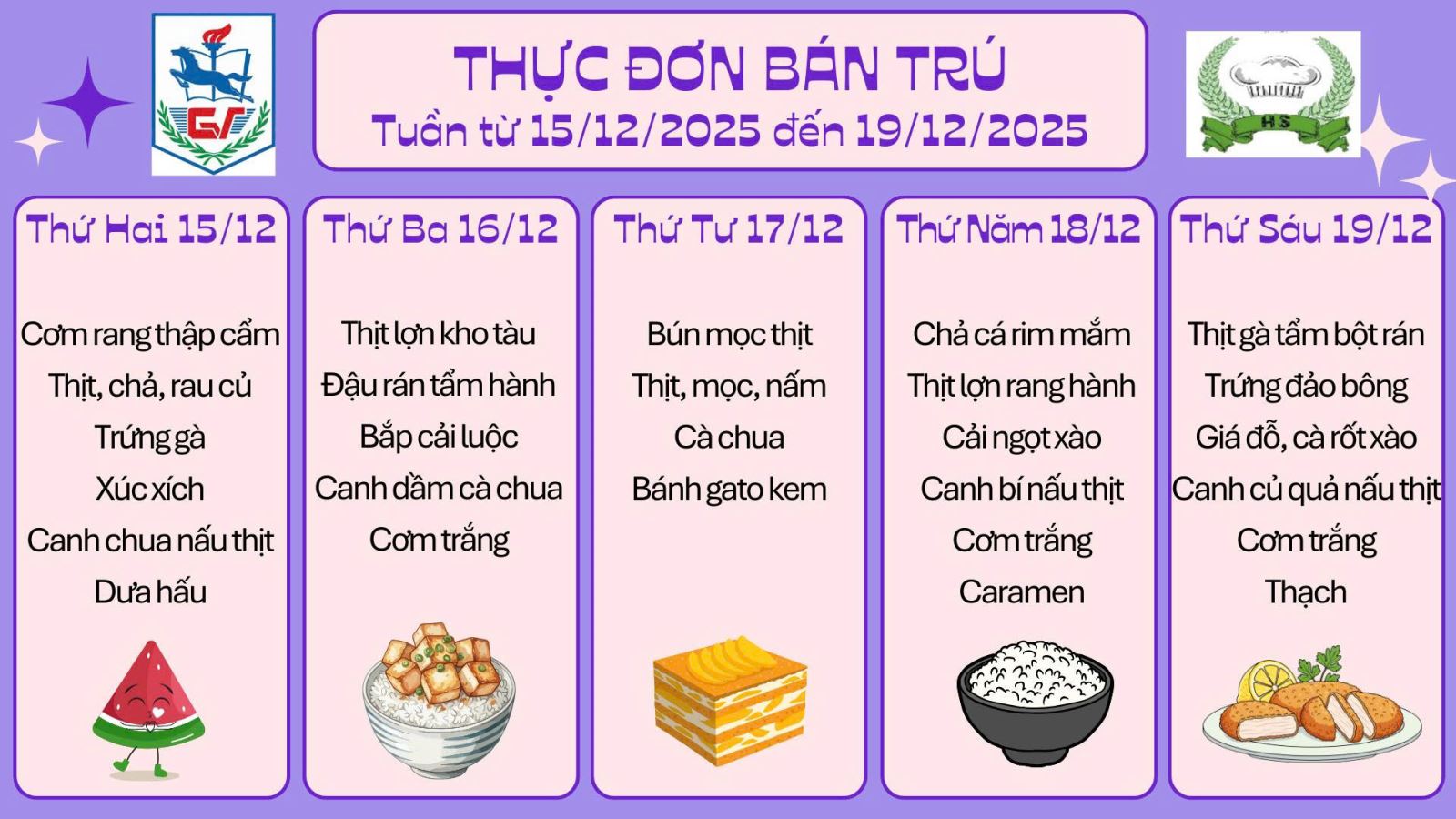 Thực đơn bán trú (Áp dụng từ ngày 15/12/2025 đến 19/12/2025)