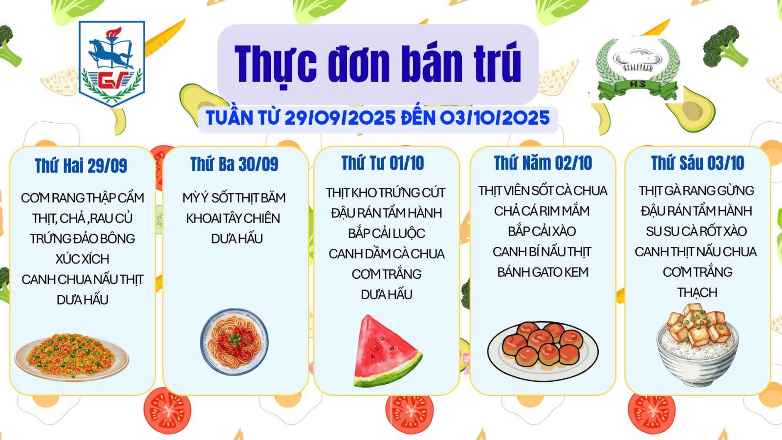Thực đơn bán trú (áp dụng từ ngày 29/09/2025 - 03/10/2025)