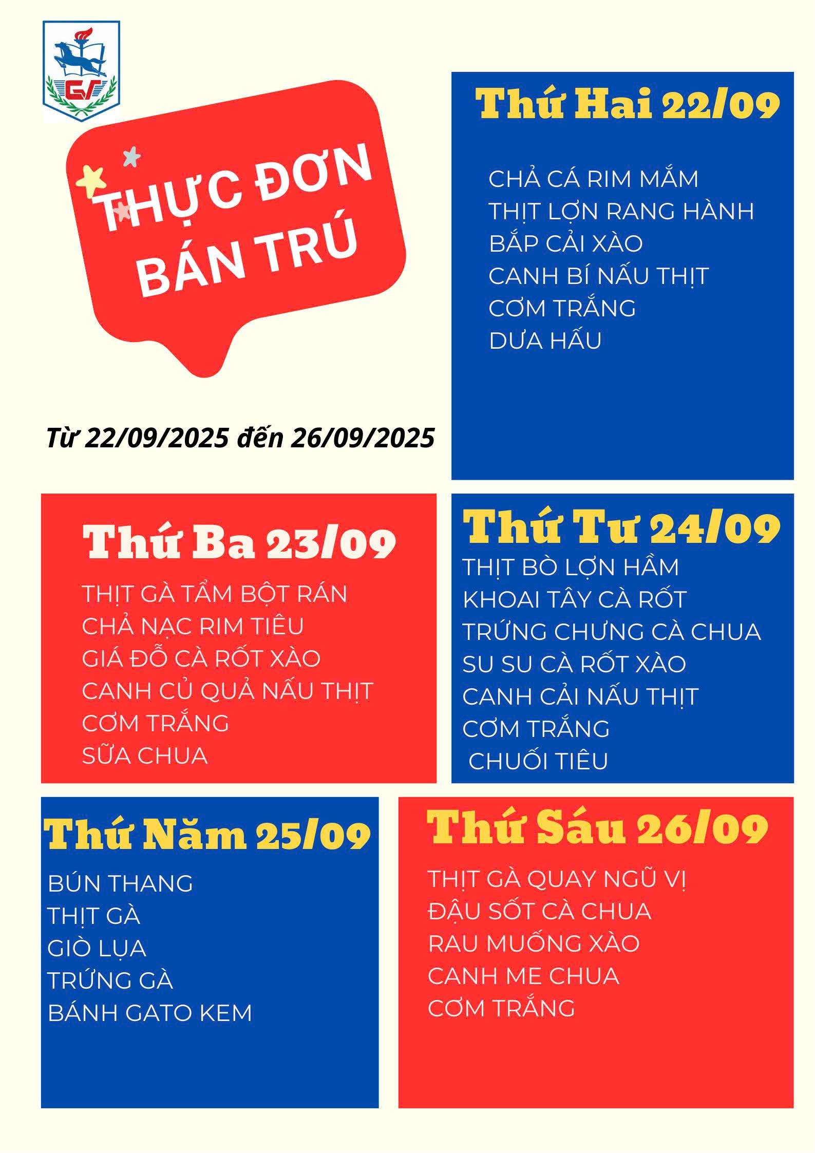 Nhà trường xin kính gửi Quý phụ huynh và các em học sinh Thực đơn bán trú (áp dụng từ ngày 22/9/2025 - 26/09/2025):