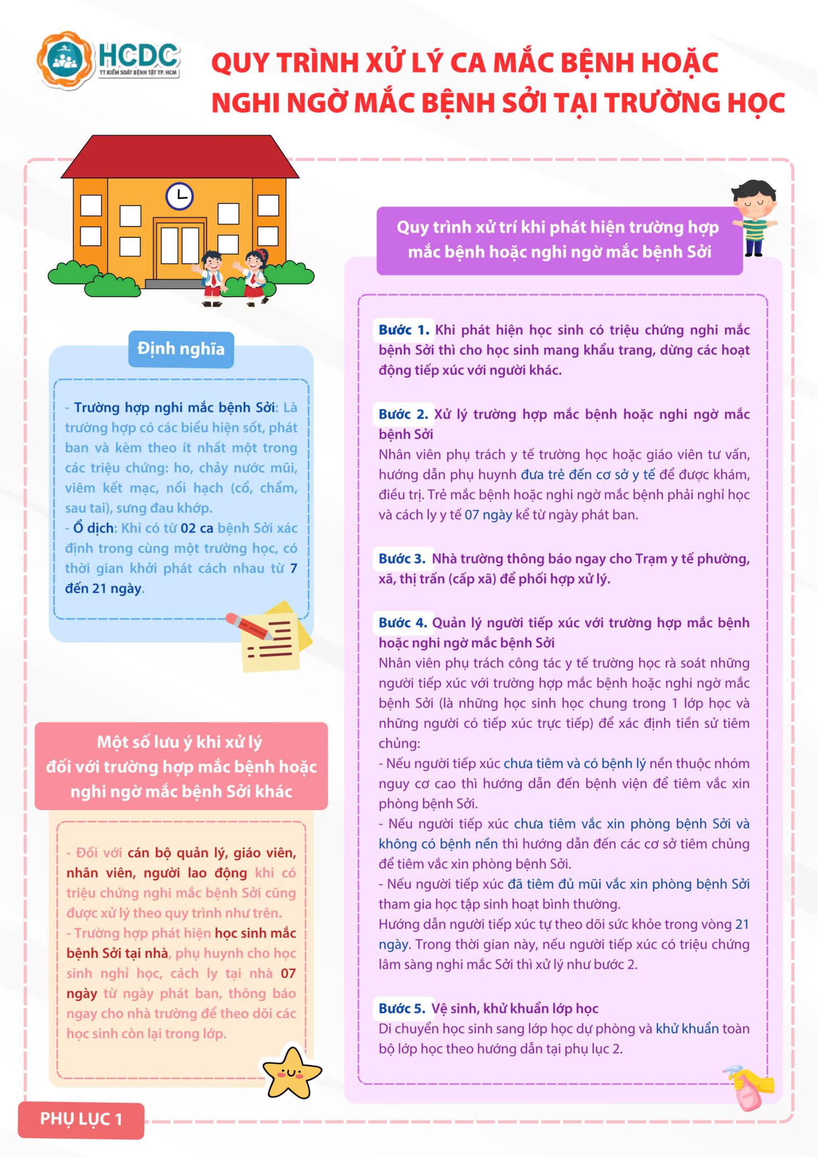 - Nếu có các dấu hiệu nghi ngờ mắc sởi như sốt, phát ban, ho, chảy nước mũi, viêm kết mạc (đỏ mắt), cần báo ngay cho giáo viên hoặc nhân viên y tế của trường; phụ huynh học sinh (PHHS) nên đưa con đi khám tại các cơ sở y tế; học sinh được phép nghỉ học cho đến khi sức khỏe ổn định.