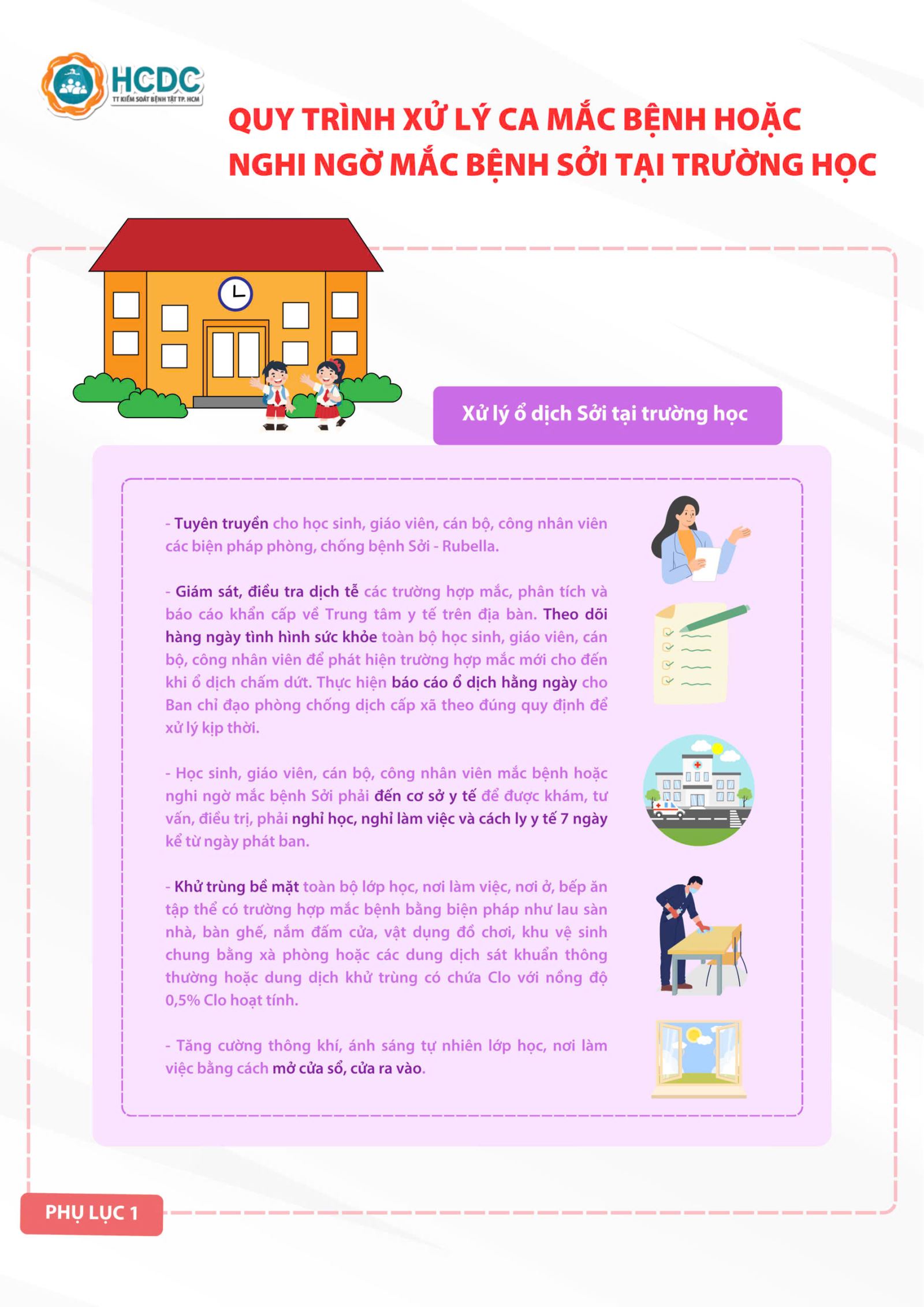 - Đề xuất với Ban Giám hiệu (BGH) cấp phát khẩu trang, nước sát khuẩn cho các lớp. - Liên hệ với PHHS đưa học sinh nghi mắc sởi đến cơ sở y tế để được khám điều trị. Đề xuất với BGH cho học sinh nghỉ học và cách ly y tế 07 ngày kể từ ngày phát ban.