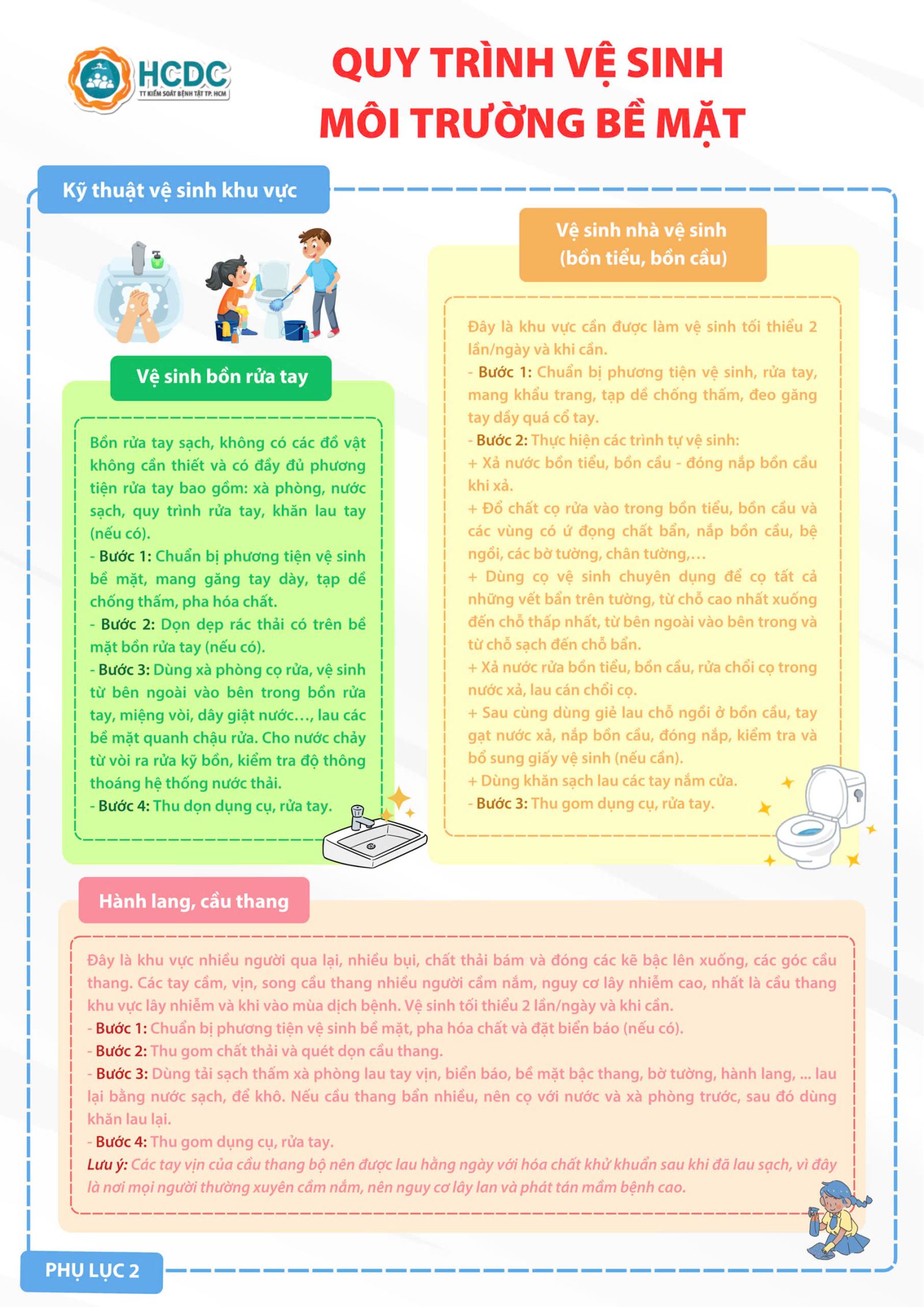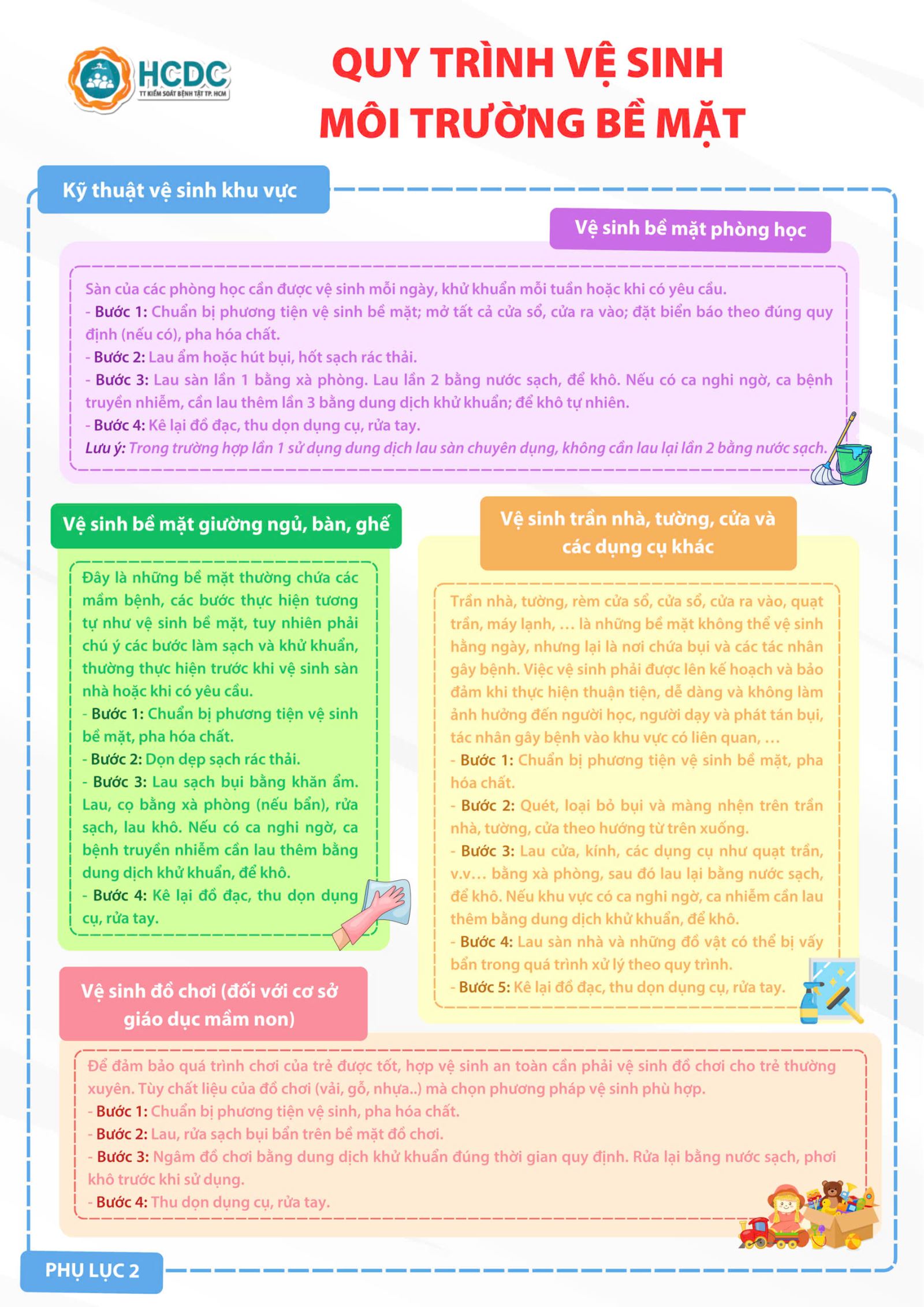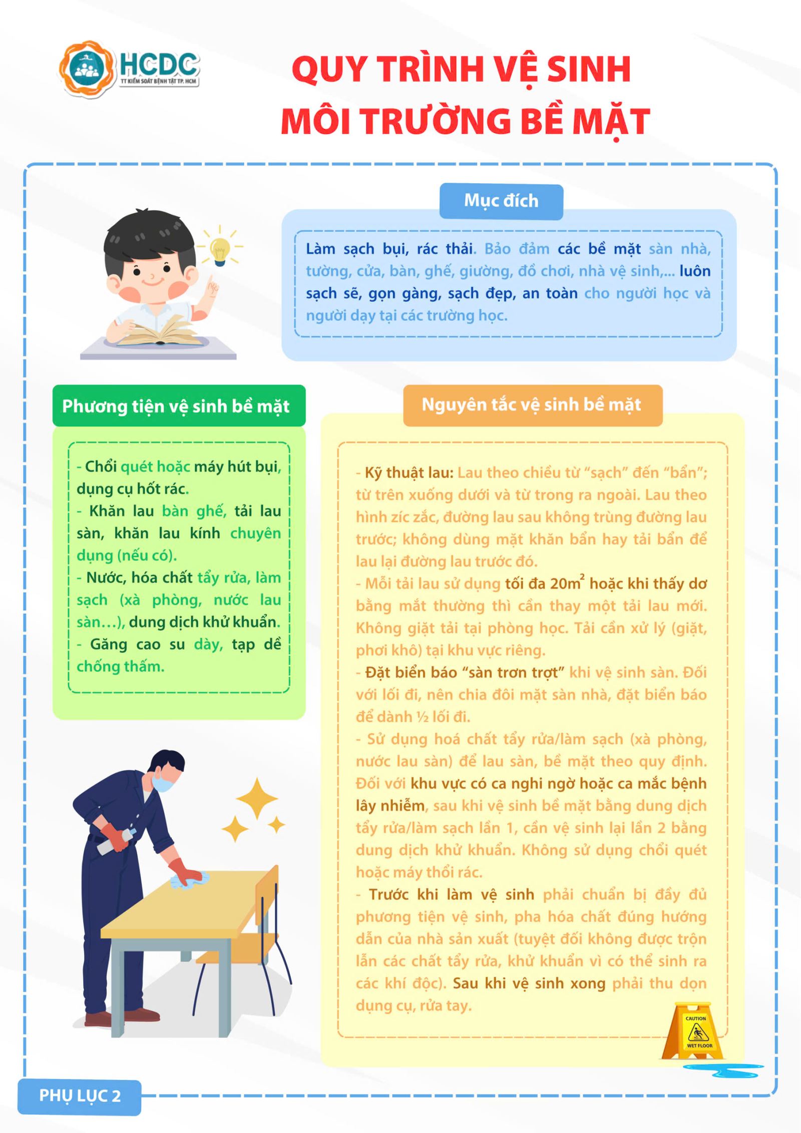 - Bộ phận lao công: Vệ sinh, khử khuẩn toàn bộ lớp học bằng Cloramin B trước và sau giờ học; dọn dẹp sạch rác trong lớp; mở tất cả cửa sổ, cửa ra vào đảm bảo lớp học được thông thoáng.