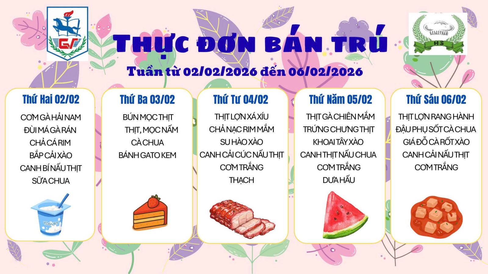 Nhà trường xin kính gửi Quý phụ huynh và các em học sinh Thực đơn bán trú (Áp dụng từ ngày 2/2/2026 đến 6/2/2026):