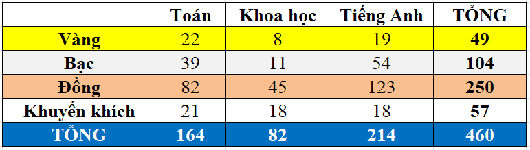 • Môn Toán đạt 164 giải, tương đương 36% tổng số giải đạt được
