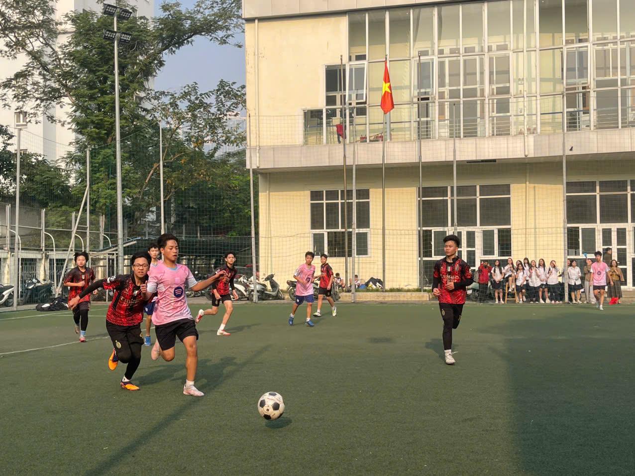 Không khí trận đấu trở nên sôi động khi cổ động viên hai lớp liên tục reo hò, tạo nên bầu không khí thể thao rực rỡ trên sân.